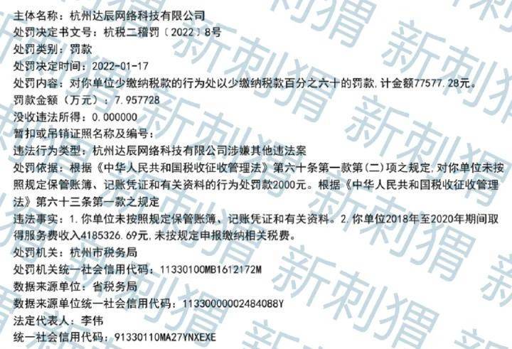 值得一提的是,2022年7月,杭州达辰网络科技有限公司因税务问题遭罚款7万余元。