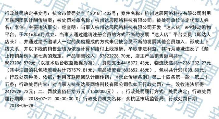 2018年6月28日,余杭区市场监管局发布行政处罚决定书显示:经查明:当事人杭州达辰网络科技有限公司开发“达人店”APP移动购物平台,于2016年6月成立。当事人通过邀请注册会员的方式不断的发展“达人店”平台会员即达人店长,并通过给予邀请人一定的奖励提成的方式来促使会员不断的发展其他会员加入,形成上下线关系,并以下线的销售业绩为依据计算和给付上线报酬,牟取非法利益。其行为涉嫌违反了《禁止传销条例》第七条的规定。产品销售收入:57522228.70元,店主产品销售返利共计8823236.579元以技术后台收益数据为准,货款支出4415372.43元,物流快递共计2361232.27元其中注册的礼包物流费共计757579.81元,商品物流费1603652.46元,包材共计531038.50元。;行政处罚种类、依据:利用互联网团队计酬传销;《禁止传销条例》第二十四条第一款、第二十五条;