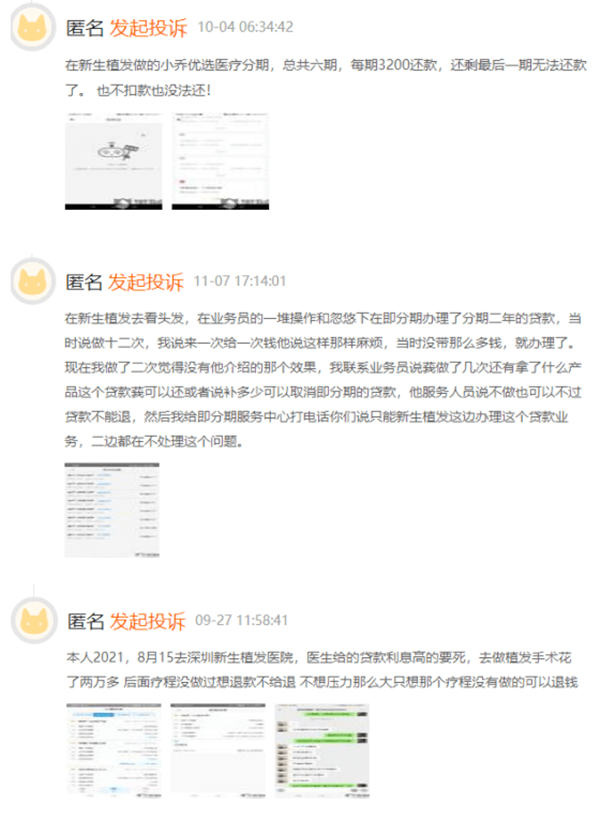 在某第三方投诉平台上,有消费者投诉称,北京新生植发门店工作人员拿着用户的手机,代为操作办理网贷,却没有提示网贷会产生高额利息。还有用户投诉称,“2021年8月15日去深圳新生植发医院,医生给的贷款利息高的很,去做植发手术花了两万多,后面疗程没做过,想退款不给退”;“10月1日看到新生植发广告,说植发价格透明,到了之后各种理由让我交钱,公司强制拿我手机操作的贷款分期,什么项目没有做,一万多块钱不退给我”。