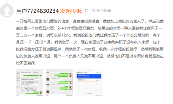 另一位用户投诉称,“2020年8月,在合肥新生植发,他们让我去做头皮检查,然后说我的头皮不办理疗就要完蛋了,然后让我办理两万多的套餐,我说没钱,还是学生,他们说让我办贷款,一步一步教唆我”。