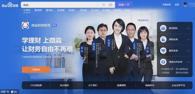 开甲财经注意到,在百度搜索框输入“微淼”并回车,页面就会跳出一个巨大的横幅广告:学理财,上微淼,让财务自由不再难。