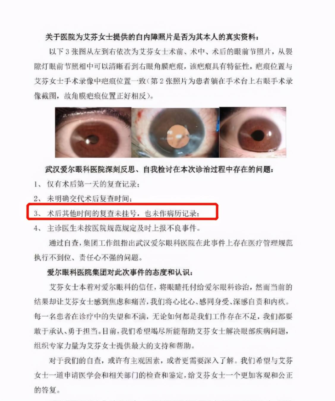 此前,武汉中心医院急诊科主任艾芬医生在武汉爱尔眼科医院接受右眼白内障手术五个月后右眼视网膜脱落,艾芬医生认为这是由于爱尔眼科不恰当诊疗造成。对此,爱尔眼科回应否认白内障手术和艾芬视网膜脱落的直接关联。艾芬随即指出爱尔眼科这是避重就轻、混淆视听、管理混乱和推卸责任。