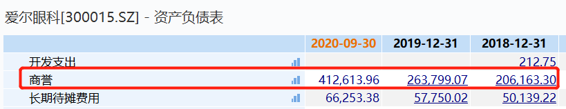 爱尔眼科资产快速扩张的同时,公司的商誉也相对增加。Wind数据显示,2018-2019及2020前三季度,爱尔眼科商誉分别为20.62亿元、26.38亿元和41.26亿元,占总资产的比重分别为21.42%、22.18%和24.97%。