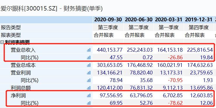 Wind数据显示,2020年前三季度爱尔眼科营业收入分别为16.42亿元、25.23亿元和44.01亿元,增速为-26.86%、0.72%和47.55%;同期净利润分别为6702.85万元、6.38亿元和9.76亿元,增速为-78.62%、52.76%和69.95%。