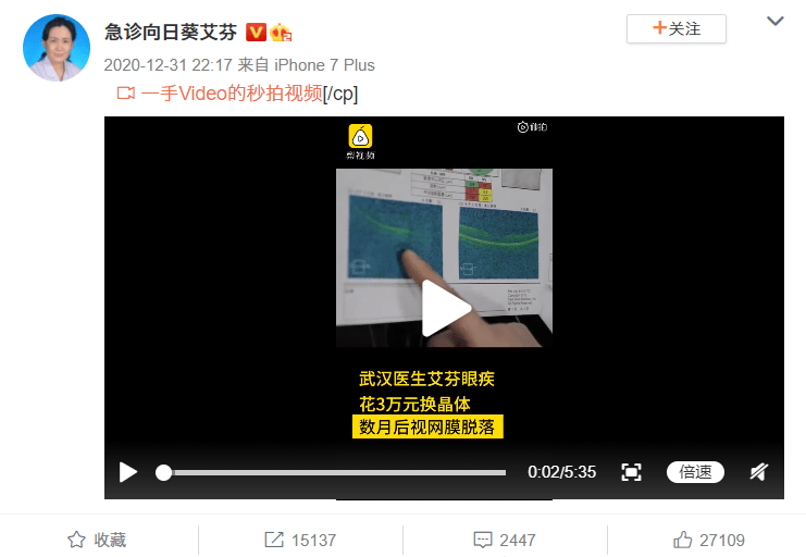 2020年的最后一天,无数人期待着跨年,盼望能辞旧迎新,武汉中心医院急诊科主任艾芬医生却在其个人微博发布第一条质疑爱尔眼科诊疗不当的视频,此后几乎每天都更新着与之相关的信息。