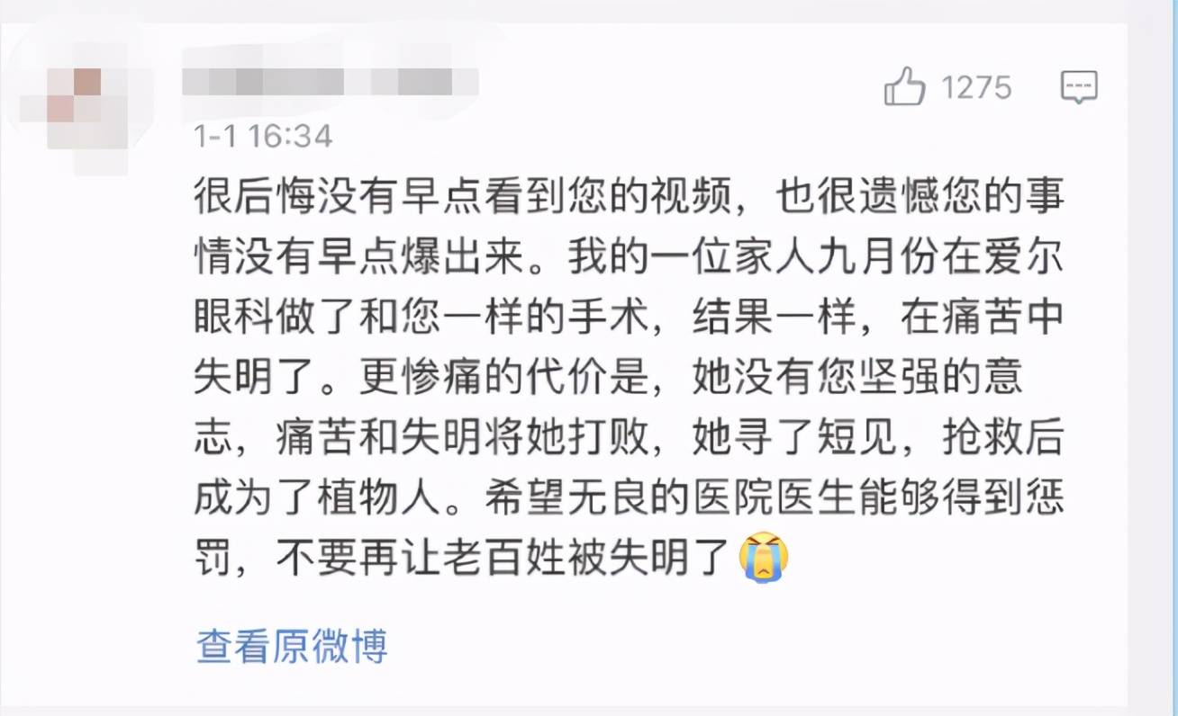 从艾芬更新的微博来看,有不少网友向其私信或直接留言反映也有类似经历。有网友称自己的家人也做了该手术,失明后寻短见,抢救回来却成了植物人。