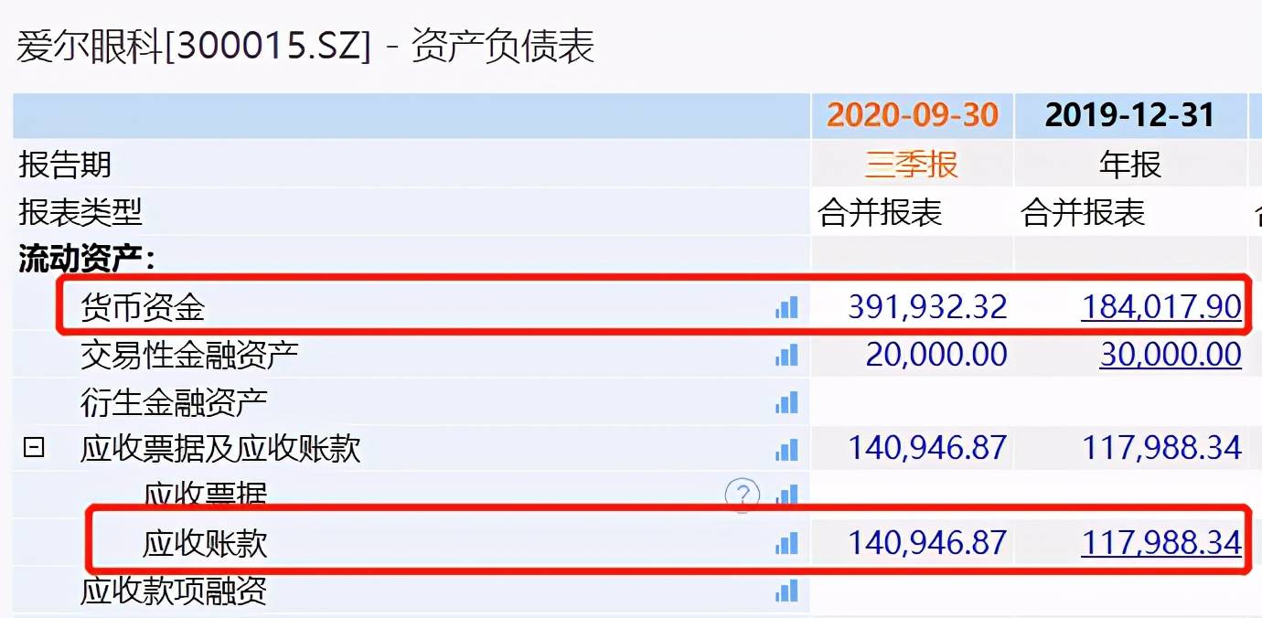 但营收的增长和经营规模扩大也使得爱尔眼科2020年第三季度应收账款较年初增长19.46%。Wind数据显示,2019年爱尔眼科应收账款为11.80亿元,2020年前三季度为14.10亿元。