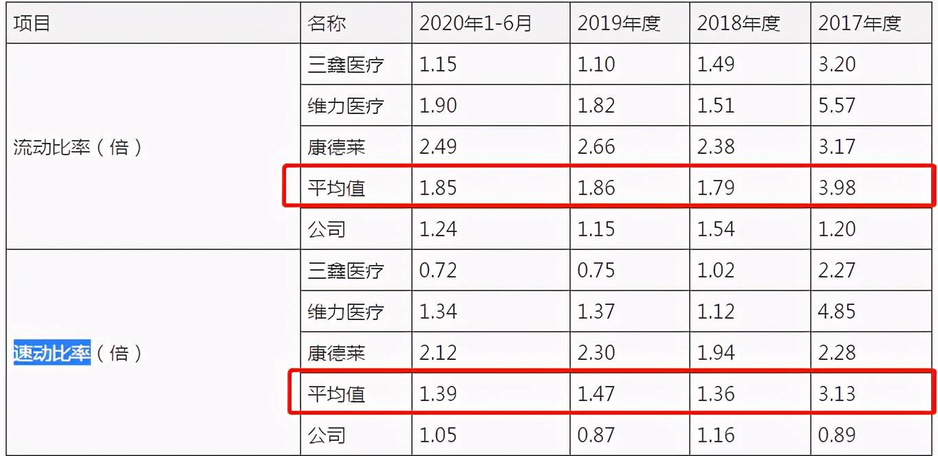 招股书中显示,从2017年到2020年上半年天益医疗流动比率分别为1.20倍、1.54倍、1.15倍、1.24倍,低于同行业平均值3.98倍、1.79倍、1.86倍、1.85倍;并且,公司速动比率分别为0.89倍、1.16倍、0.87倍、1.05倍,低于科比同行业平均值3.13倍、1.36倍、1.47倍、1.39倍。