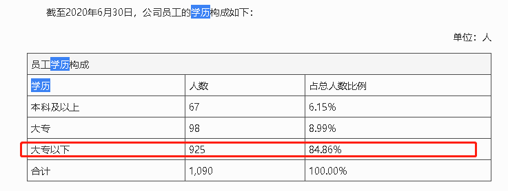 而在公司员工学历构成中,有84.86%的员工为大专以下文化水平,本科及本科以上学历员工仅占总人数的6.15%。