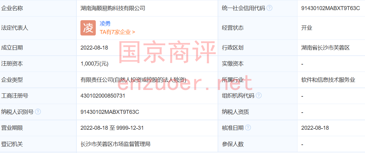 海顺易购公司全称为“湖南海顺易购科技有限公司”,成立于2022年8月18日,也就5个月时间,法人代表为凌勇,监事为王佳丽,注册资本1000万元整,但至今未缴,参与社保人数0人!更可笑的是,一个号称技术服务,技术开发的公司,拿到的行政许可证竟然是“食品经营许可证”。