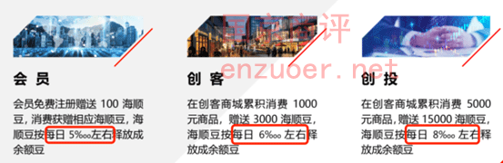 从模式来看,海顺易购有会员、创客、创投三个等级,会员免费注册,创客创投都需要消费一定金融,也就是“入场券”。消费多少送多少海顺豆,海顺豆可以变成余额豆,余额豆可以提现,相当于你先花钱买东西,再慢慢把钱还你,很明显的“购物返利”模式。不过想要得到海顺易购的返现可不容易,资料的返现范围是5‱,也就是0.05%,按照这个比例返现,100枚海顺豆得用半年时间才能变成余额豆提现,你的钱被套牢了,半年后项目在不在都不知道。
