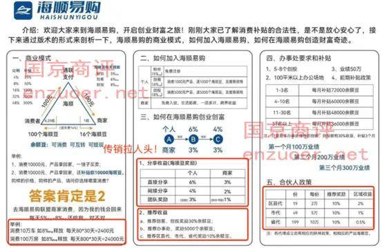 国京商评根据推广资料,海顺易购是集社交流量、传统电商、积分模式、消费返现、分享激励模式为一体的新零售平台,目的是让人人赚钱,实现消费者、商家、平台三方共赢。看着挺美好,实则就是典型的积分返利,拉人头传销模式。