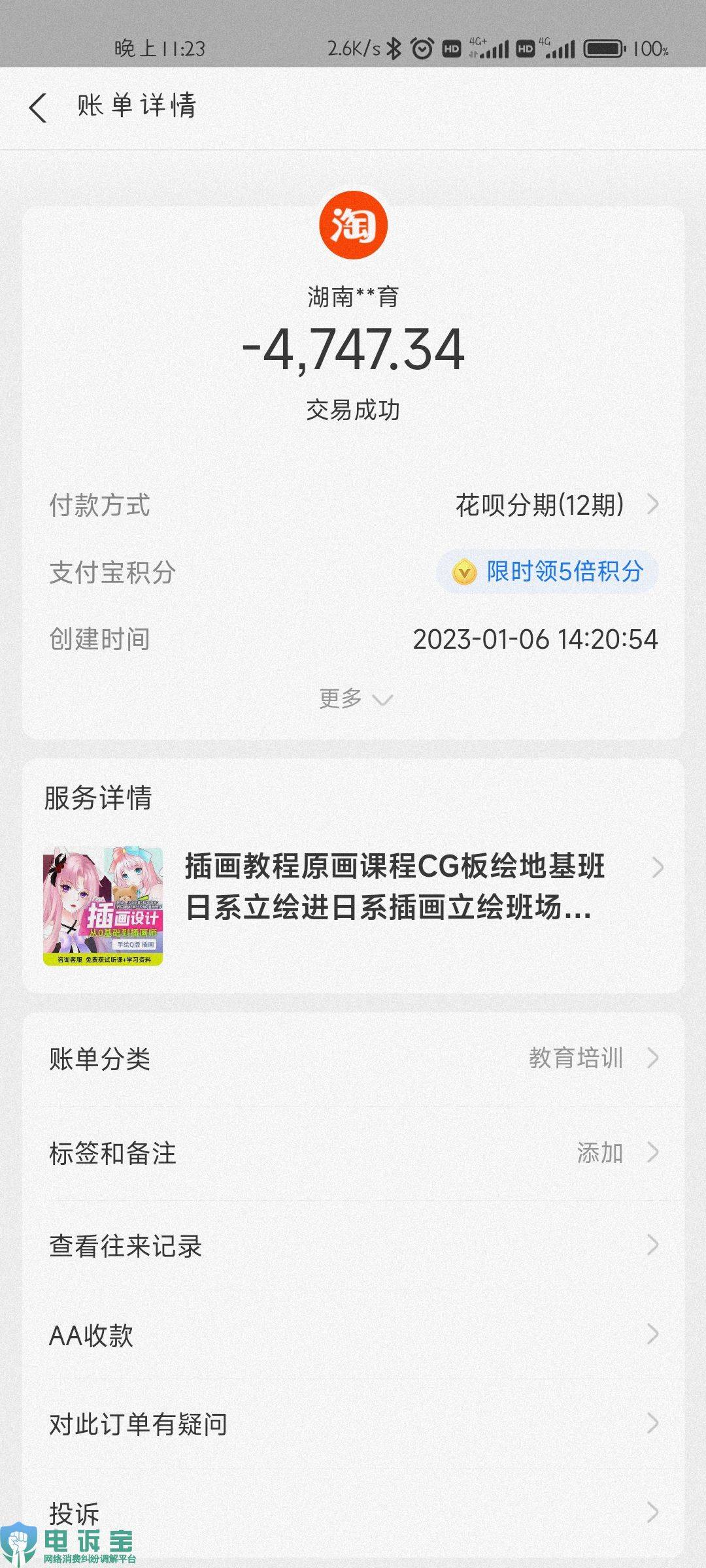 1月12日,云南省的陈先生向“电诉宝”投诉称其在微信朋友圈看见的绘画兼职广告,然后就咨询,他们说1元钱试看一节课,然后就诱导自己消费,他们说的七天无理由退货,然后就想着试试。