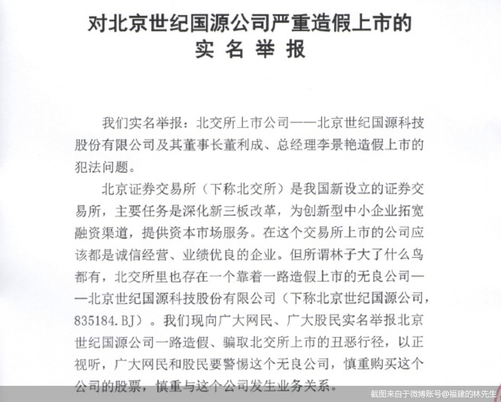 近日,中闰科技股份有限公司(以下简称“中闰科技”)在微博实名举报北交所上市公司国源科技(835184)资格证书等造假,北京商报记者联系到举报人,进一步了解了相关情况。举报人表示,国源科技存在专业技术资格证书作假、炮制假的资质证书、业绩证明文件等情况。
