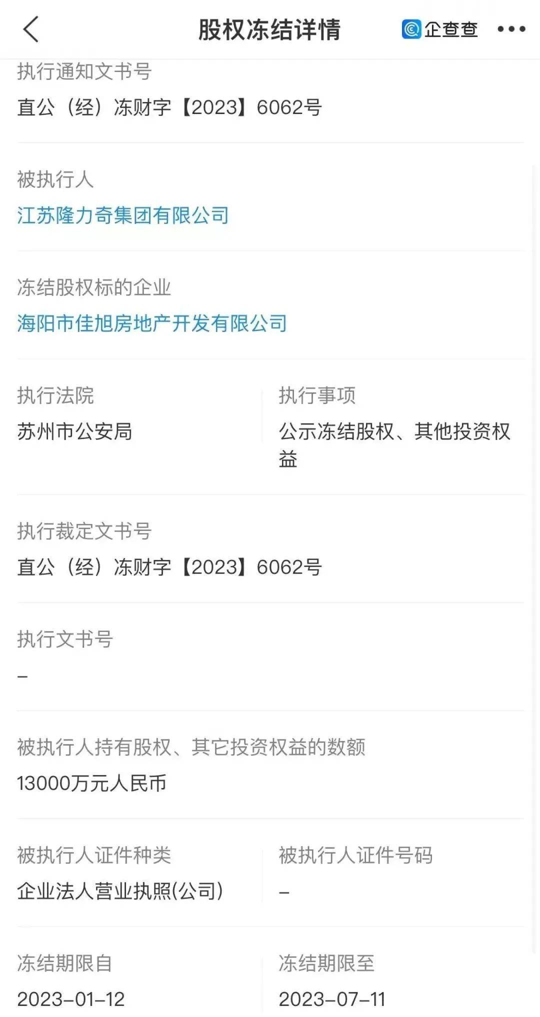 企查查显示,1月12日,苏州市公安局冻结了隆力奇集团在潍坊农村商业银行的2000万股权,以及隆力奇集团在海阳市佳旭房地产开发有限公司的1.3亿股权,合计1.5亿,冻结时间为2023年1月至2023年7月,共计180天。