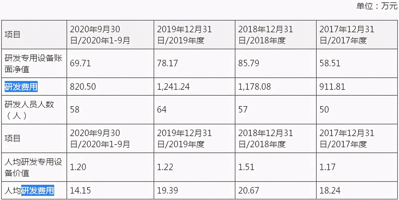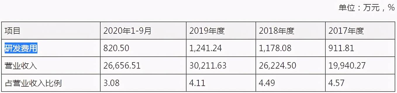 据招股书披露,2017-2020年三季度,铁拓机械的研发费用分别为911.81万元、1178.08万元、1241.24万元和820.50万元,占营业收入的比例分别为4.57%、4.49%、4.11%和3.08%,公司研发费用率逐年下滑。