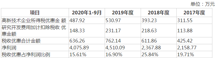 值得注意的是,铁拓机械的 税收优惠占净利润比例较高。2017-2020年前三季度,铁拓机械的税收优惠合计金额分别为425.42万元、611.86万元、762.14万元和636.26万元,占净利润的比例分别为19.71%、25.84%、16.90%和15.61%。
