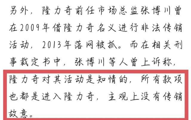 其实早在2009年时,隆力奇前任市场总监张博川就因为非法传销被警方抓捕,他在裁定书中也表示这一切都是公司知情并表示支持的。