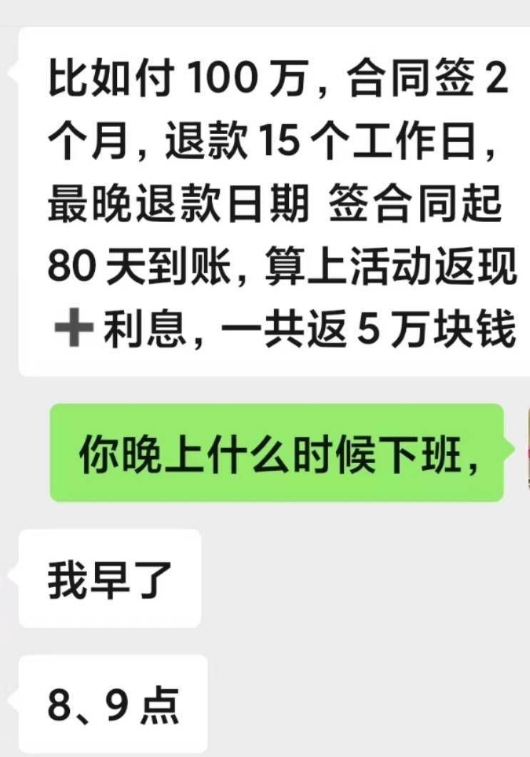 董昊懊恼不已:“销售当时说,‘100万元的话,先就有3万元奖励,合同签2个月,退款15个工作日,签合同起80天到账,算上活动返现+利息,一共返五万元。’我当时也是脑子糊涂了,旧房子卖掉了,有100万元现金,本来要留着给儿子买新房。”