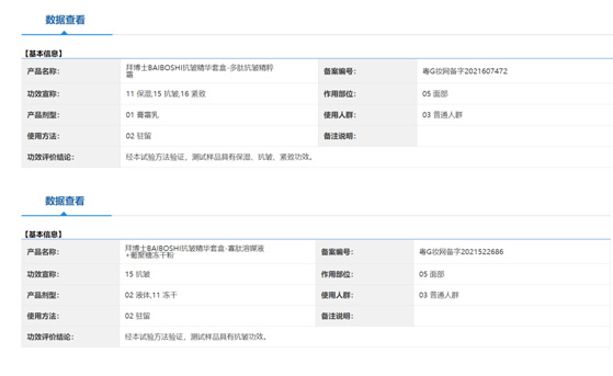 本网通过国家药品监督管理局数据查询发现,拜博士BAIBOSHI抗皱精华套盒-多肽抗皱精粹及寡肽溶媒液+葡聚糖冻干粉的功效评价结论为仅具有保湿、抗皱、紧致的功效。