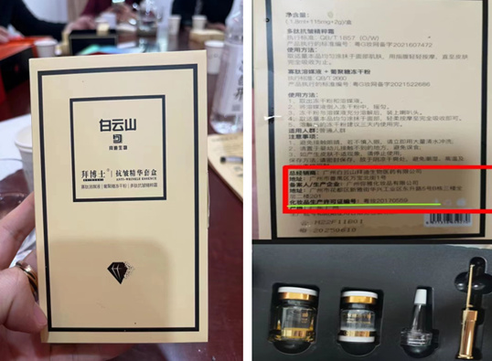 本网通过产品外包装发现白云山拜博士抗皱精华套盒生产企业为广州弥雅化妆品有限公司,化妆品生产许可证编号:粤妆20170559。内含“多肽抗皱精粹霜”和“寡肽溶媒液+葡聚糖冻干粉”,前者的产品执行的标准编号为粤G妆网备字2021607472,后者的产品执行的标准编号为粤G妆网备字2021522686,很显然,这款产品仅为国产非特殊用途化妆品。