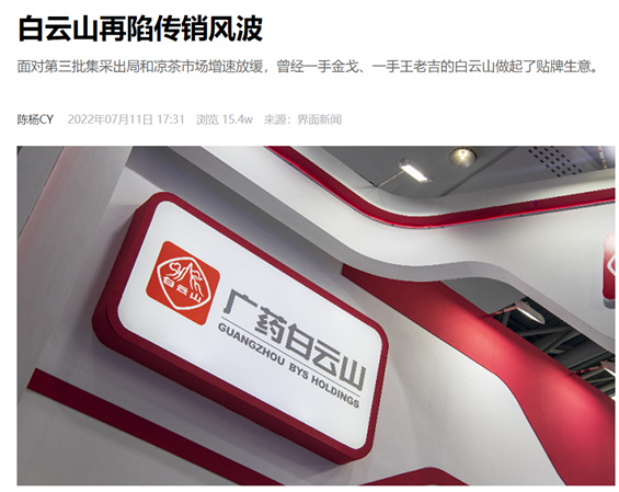 2022年7月11日,界面新闻发文称白云山再陷传销风波,文章一开始就剑指广药白云山又一产品被指涉及传销。这款被点名的产品名叫“潘高寿透骨草膏”,产品的备案人和总经销为白云山控股子公司、广州白云山潘高寿药业股份有限公司。在文章中,界面新闻历数广东思埠集团与王老吉品牌合作推出的“哔嗨啤”啤酒项目、王老吉“吉宝清养益”、王老吉“吉悠”的植物饮料都曾因涉嫌传销站上舆论的风口浪尖。