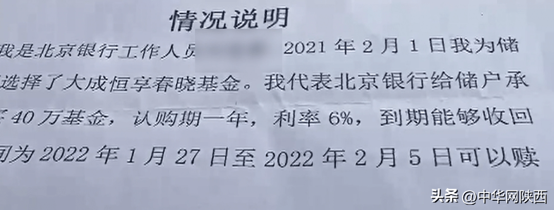 周先生在面对错过赎回期限后,只能收下这份《情况说明书》,一直等到今年1月进行了赎回。而那时才发现,40万本金只剩下39万,还有19200元没有支付,而这两年间,刘某还为周先生支付过一笔两万多元利息,总账算下来没有什么损失。但对老年人来说,这一笔退休资金从保本产品莫名变成中高风险的基金,两年多时间里被套在里面,担惊受怕,被迫“炒基金”,而导致这种情况的北京银行和其员工,却想撇清责任。北京银行西安文景小区社区支行的相关负责人对这份《情况说明书》拒不承认,表示北京银行不可能出具这种情况说明,章子也不是该行的。更是以刘某已被开除为由,表达责任不在北京银行,北京银行还保留对其追究法律责任的条款。