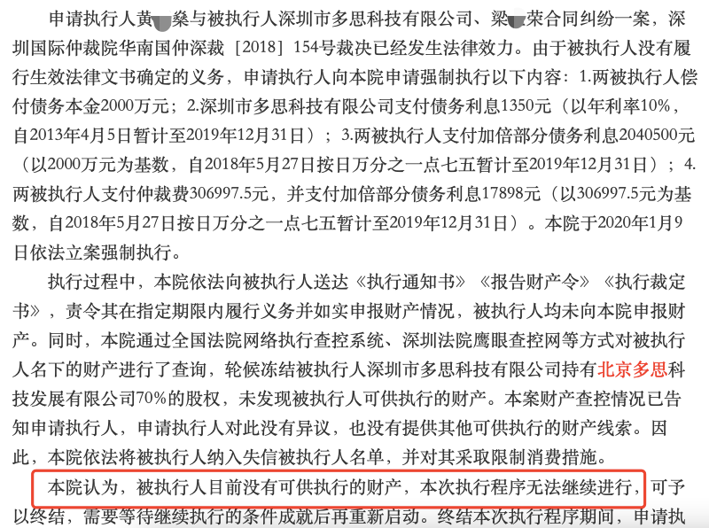 2020年5月27日,广东省深圳市中级人民法院执行裁定书显示,关于申请执行人黄某与被执行人深圳多思、深圳多思法人梁仕荣合同纠纷一案,依法立案强制执行深圳多思、梁仕荣偿付债务本金2000万元及利息等,但两被执行人无可供执行的财产。