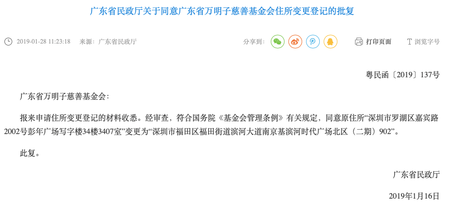 2月24日,时代财经查询广东省民政厅官网,并没查询到民政厅同意万明子基金会认定为慈善组织的批复,只查询到关于同意其住所变更登记的批复,变更为“深圳市福田区福田街道滨河大道南基滨河时代广场北区(二期)902”。时代财经在慈善中国官网搜索,同样查找不到该基金会。