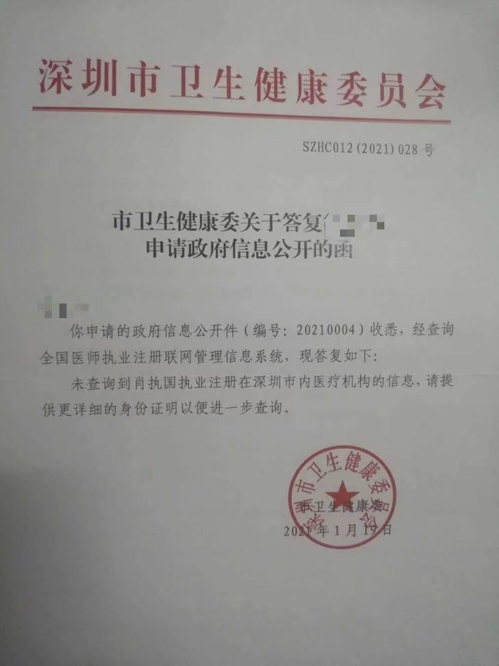 此前有媒体报道称肖执国涉嫌无证行医,深圳市卫健委曾答复称深圳市没有名叫肖执国的具有执业资格的医生