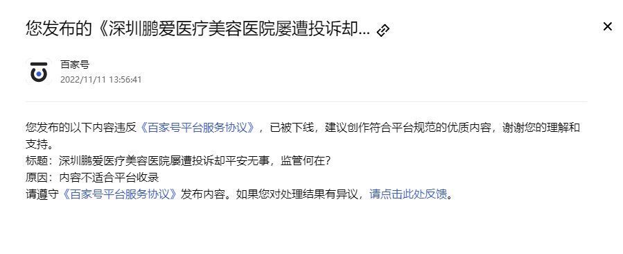 2月16日,受害人李先生(化名)告诉记者,有关其曾在深圳鹏爱医疗美容医院疤痕修复而致毁容受害一事,有多家媒体曾对其进行了采访、报道,但是在一个月后文章便被下架删除,李先生本人在知乎平台发布的举报信也被深圳鹏爱医疗美容医院投诉删除,李先生怀疑,是深圳鹏爱医疗美容医院的人花钱找了从事“有偿删帖”的非法人员伪造举报材料对这些文章进行了虚假投诉。