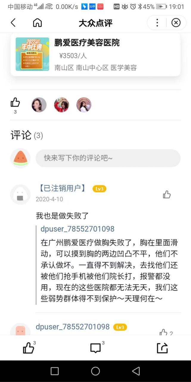 深圳鹏爱医疗美容医院到底是为了删帖不择手段还是花钱找了从事“有偿删帖”行业的职业删帖人,两者必有其一。如果是前者,这样一家为了删除来自自家患者的真实投诉举报,而不惜撒谎声称“我们医院没有肖执国这个医生”的医院,如此的不负责任,怎么能让其他患者放心、安心?如果是后者,那么为其提供“有偿删帖”服务的非法人员则涉嫌非法经营罪。