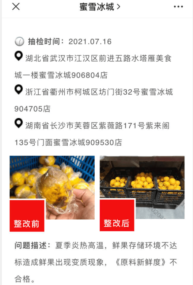 同期,蜜雪冰城也通过官方微信进行“自我检讨”:在2022年1月、2021年12月、7月企业内部自查中就发现,湖北武汉、浙江衢州、湖南长沙等地门店出现水果变质问题;山东济南、河北邯郸、云南昆明、河南信阳等地门店员工不戴手套,直接接触水果原料等问题。