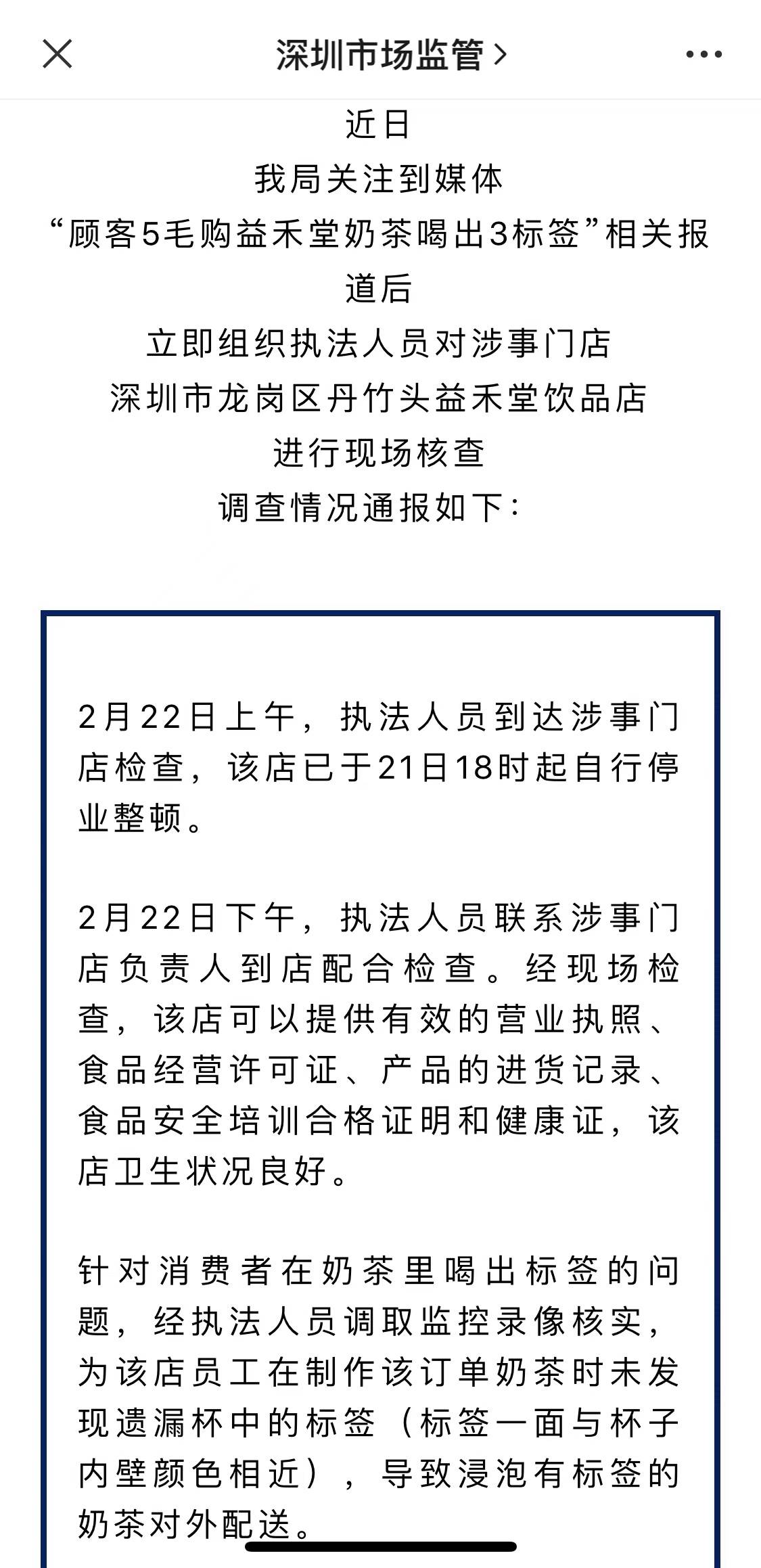 2月23日,深圳市场监管局在官方微信通报:“顾客5毛钱购益禾堂奶茶喝出3个标签”事件,表示经核实,该店员工在制作奶茶时,未发现遗漏杯中的标签。双方已和解,现已责令涉事门店完善操作规程。