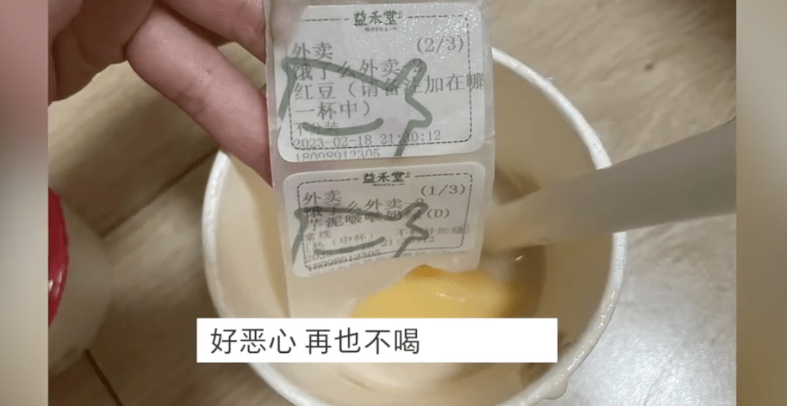 原来一位女生近期在益禾堂茶饮门店购买了一杯奶茶,结果她喝到一半的时候发现奶茶杯中竟然泡着3个标签。