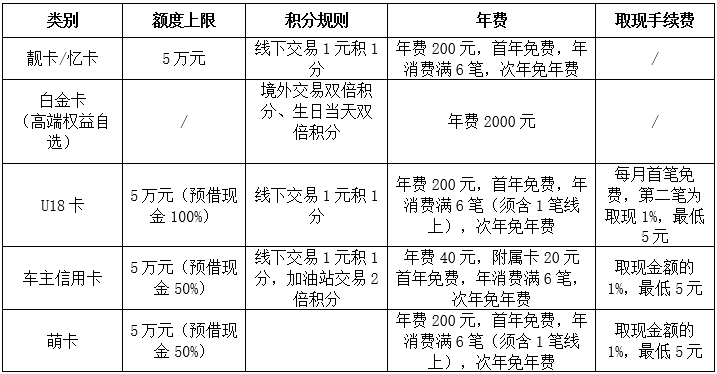 盛京银行官网显示,该行信用卡产品包括靓卡、白金卡、U18卡、车主信用卡、萌卡、忆卡等多种类型,基本信息如下: