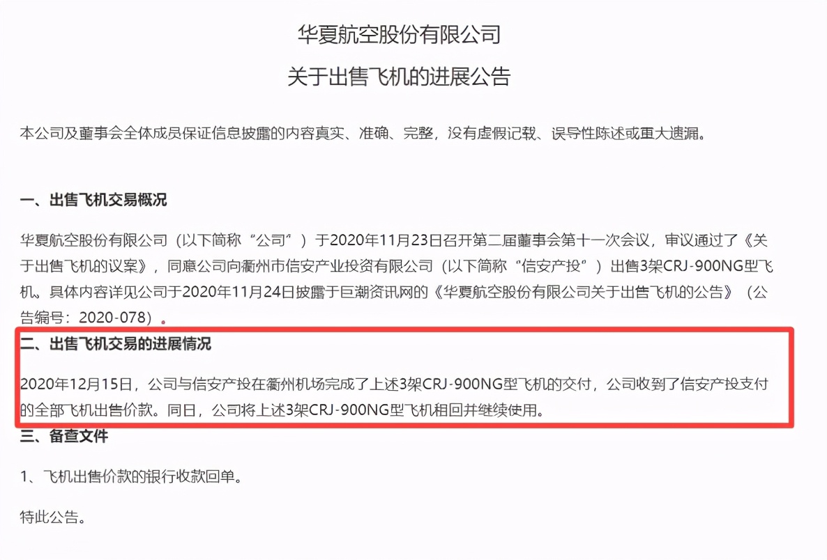 12月15日,华夏航空发布公告称,与衢州市信安产业投资有限公司(以下简称“信安产投”)在衢州机场完成了3架CRJ-900NG型飞机的交付,并收到了信安产投支付的全部飞机出售价款。同日,华夏航空将上述3架CRJ-900NG型飞机租回并继续使用。