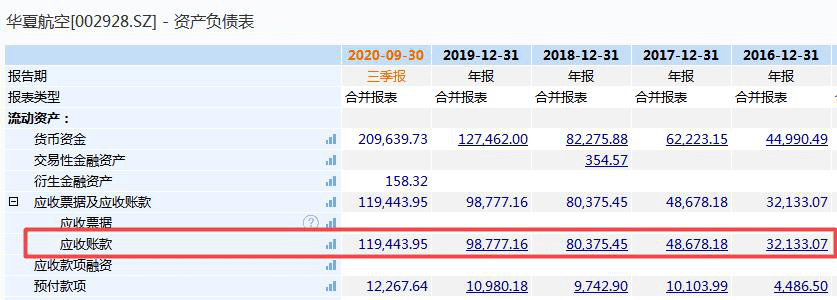 另外,从应收账款来看,其数额逐年增长。2016年-2020年前三季度,华夏航空的应收账款分别为3.21亿元、4.87亿元、8.04亿元、9.88亿元和11.94亿元。而令人意外的是,华夏航空今年前三季度的应收账款远高于去年一整年的应收账款数额。