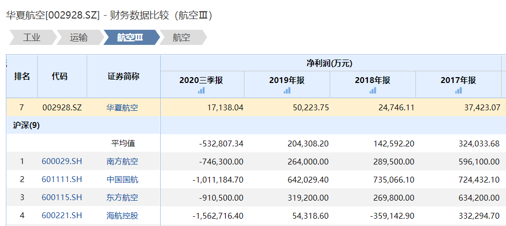 值得注意的是,Wind同业财务数据比较显示,华夏航空三季报净利润高于同行业平均值的-53.29亿元,且将净利润分别为-74.63亿元、-101.12亿元、-91.05亿元和-156.28亿元的四大航空公司远远甩在后面。而在此之前的2017-2019年,华夏航空的净利润都远低于四大航空公司和行业平均值。