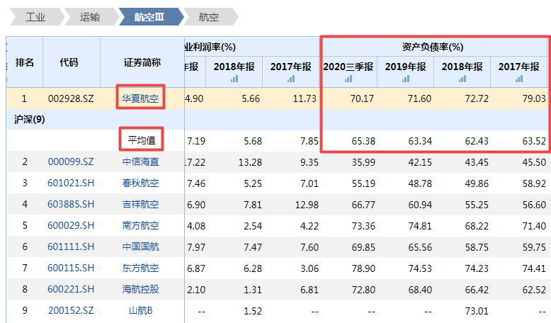 Wind数据显示,2020年前三季度,华夏航空的资产负债率为70.17%,高于行业平均值65.38%;同时,2017-2019年,华夏航空的资产负债率分别为79.03%、72.72%和71.60%,一直高于同行业平均值。