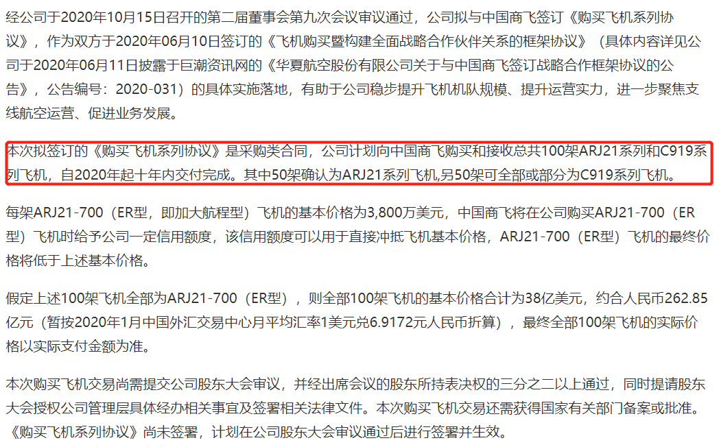 此外,今年11月15日,华夏航空发布了关于拟签订《飞机买卖协议》和《飞机买卖通用条款协议》及相关补充协议的公告。公告称公司拟向中国商飞有限责任公司购买和接收总共100架ARJ21系列和C919系列飞机,自2020年起十年内交付完成。今年中国商飞有限责任公司计划向华夏航空交付2架飞机。