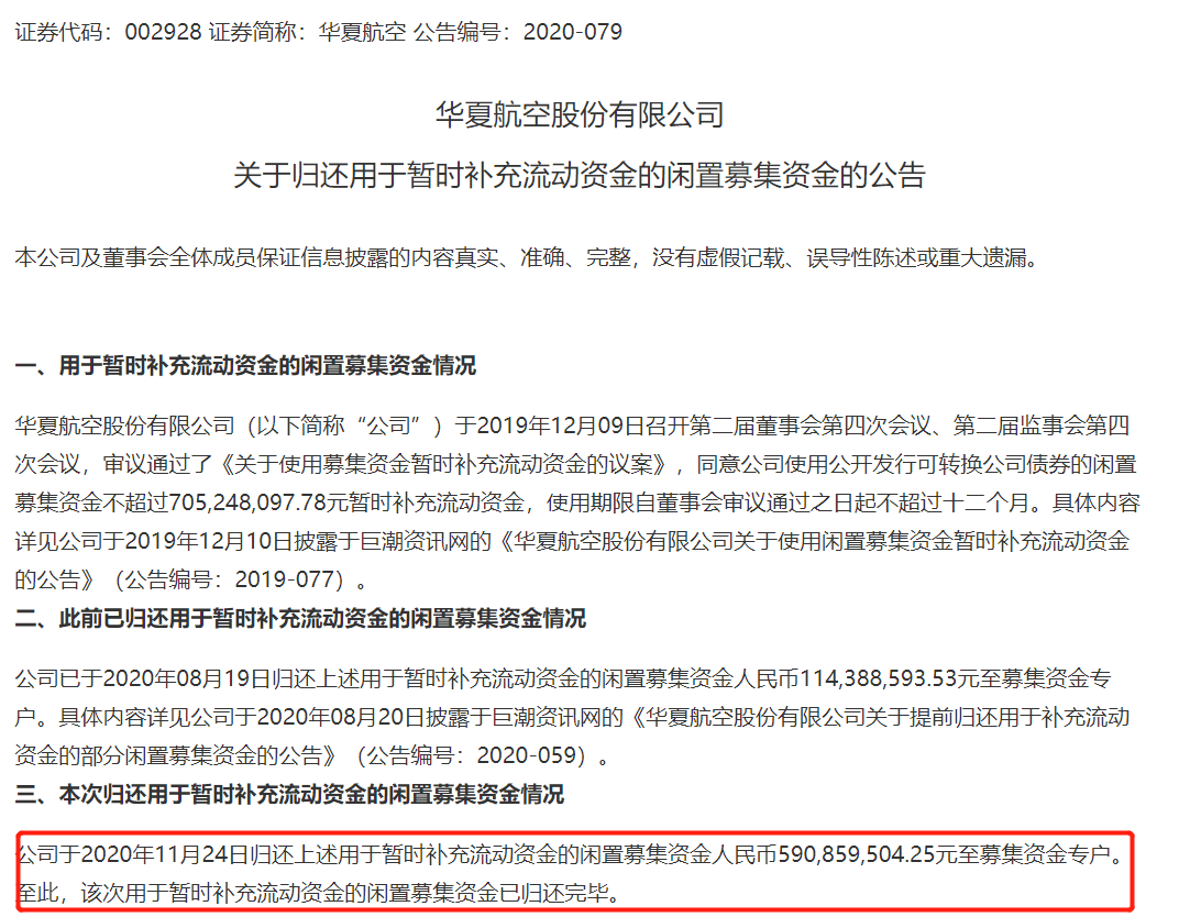 华夏航空为何在收购100架飞机后仅一个月又选择出售飞机?具体原因我们无从知晓,不过在宣布出售飞机后华夏航空还发了一则关于归还用于暂时补充流动资金的闲置募集资金的公告,公告称公司于2020年11月24日归还用于暂时补充流动资金的闲置募集资金人民币近5.91亿元至募集资金专户。