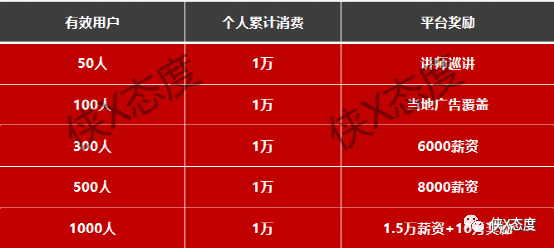 服务中心有效用户达到1000人,个人累计消费1万元,平台奖励每月1.5万薪资以及额外的10万元奖励。
