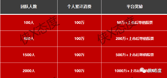团队拥有2000人,个人累计消费达到100万元,可获得1000万奖励+上市后等值股票。