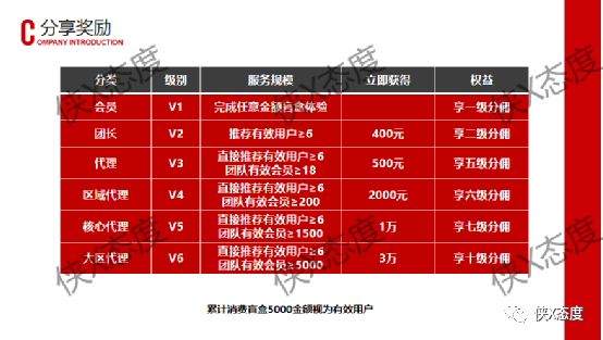 据该平台推广资料介绍,参与用户通过达成一定要求,可获得不同等级的代理,同时获取不同等级的奖励和分佣,该平台代理分为会员(V1)、团长(V2)、代理(V3)、区域代理(V4)、核心代理(V5)、大区代理(V6)六个等级。