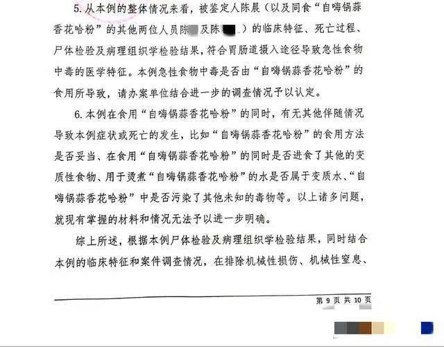 该鉴定意见书还载明,根据本例尸体检验及病理组织学检验结果,同时结合本例的临床特征及案件调查情况,在排除机械性损伤、机械性窒息、致死性疾病及其他可能导致死亡的情况下,综合分析认为,陈晨的死亡不排除食用“自嗨锅蒜香花蛤粉”导致急性中毒死亡的可能。