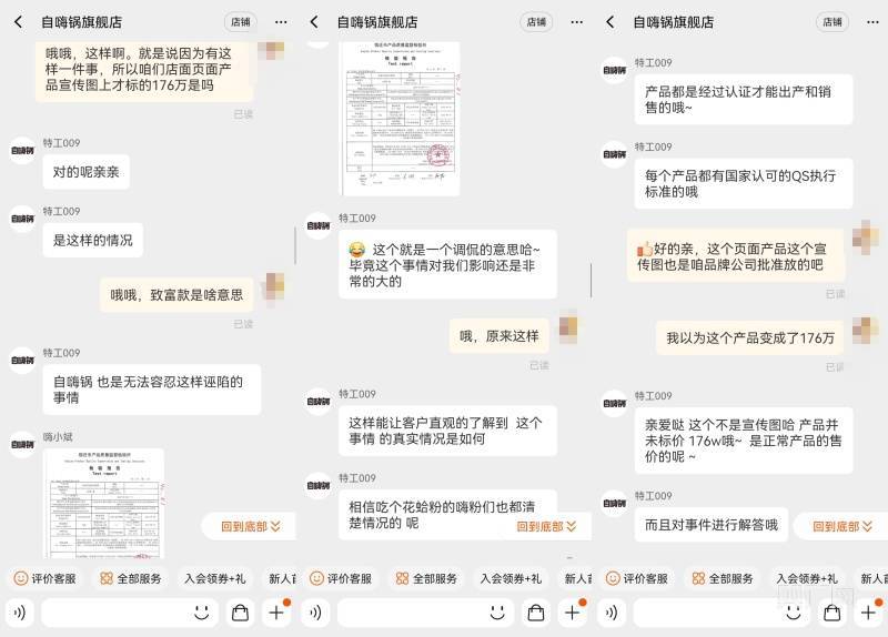 “这不是宣传图,产品并未标价176W,不是正常产品售价,图片是对事件进行解答。”客服同时还发来了检测报告,说这就是个“调侃”,“毕竟这个事情对我们影响非常大,只是让客户直观了解到这个事情的真实情况。”