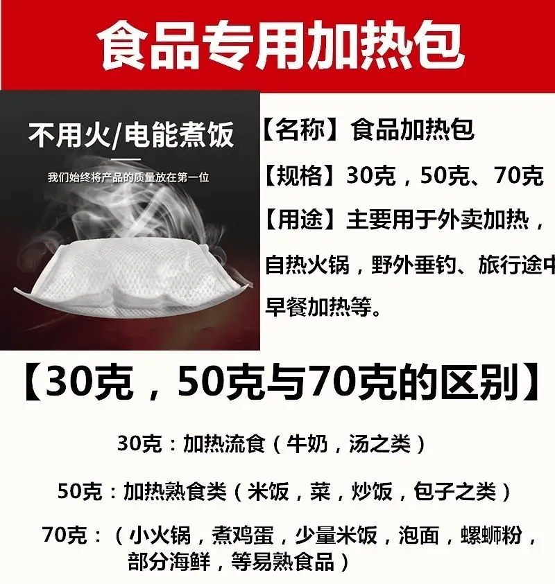 发热包,就像一个在初高中化学实验中才会做的实验——加热内的生石灰、碳酸钠、硅藻土、铁粉、铝粉、活性炭、盐等成分遇水后发生化学反应,释放热能并产生水蒸气,从而煮熟食物。