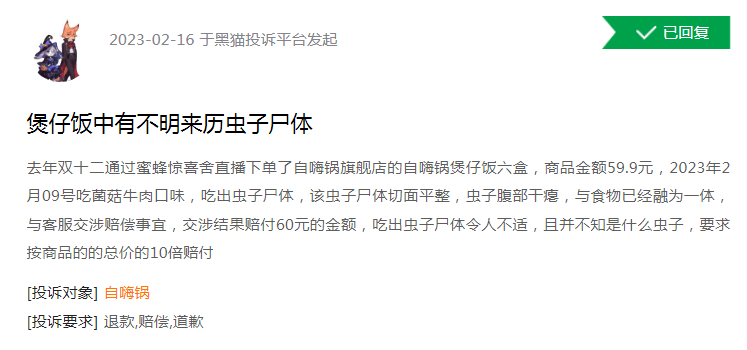 黑猫投诉上,自嗨锅的投诉多达370条,其中多为吃出不明毛发、虫子尸体、包装破损发霉。其中,最让人心惊的“发热包破损爆炸”也早已是老生常谈。