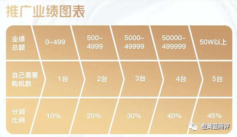 例如你是A你推广了B, B购买了10台柜机。B每天收益800元那么你的推广业绩就是800元/天你得800*20% =160元/天例如B再推广了C购买柜机,以此类推以你A为首的团队里所有人的收益都算做你的推广业绩你可根据相应业绩拿到相应的区间奖励。